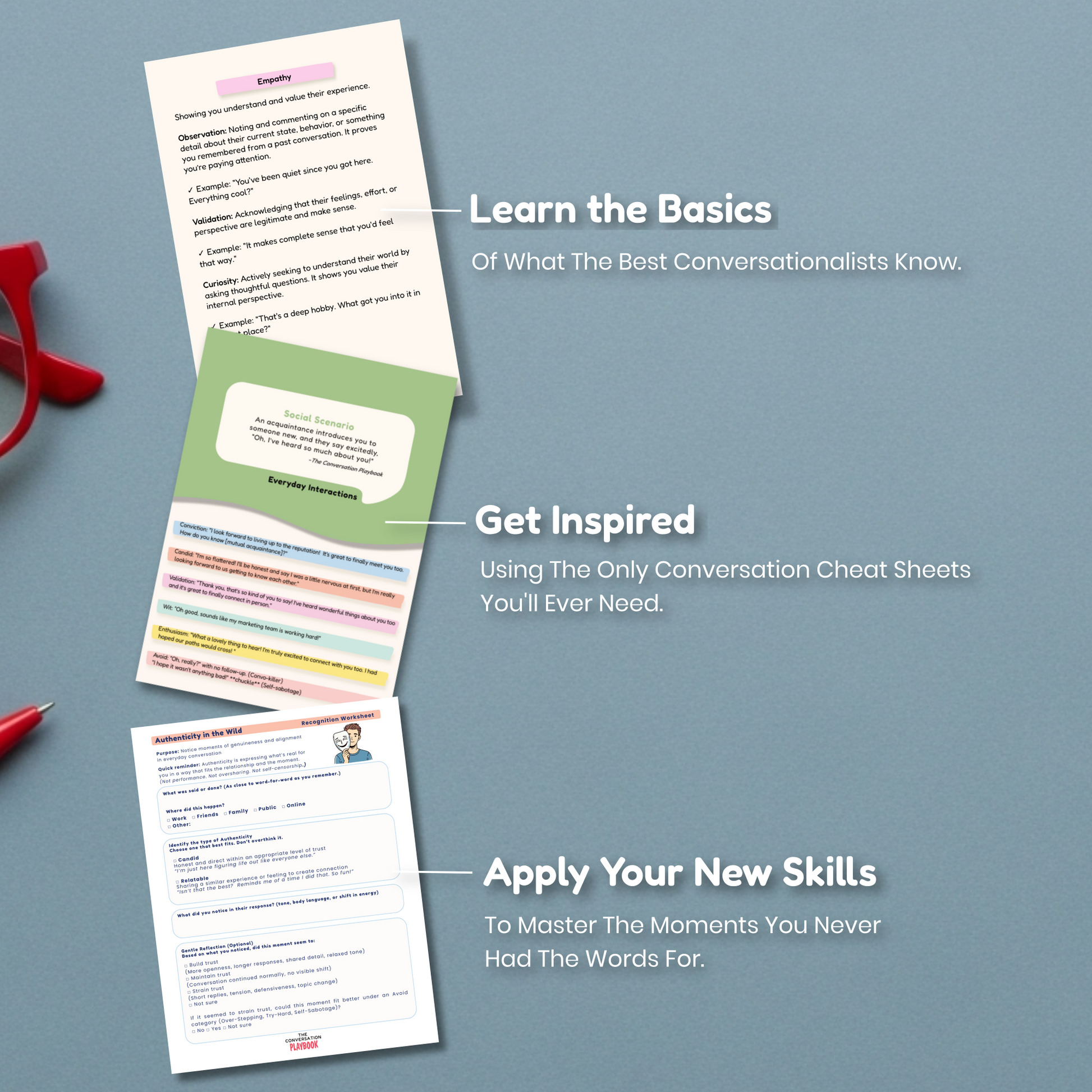 The Conversation Playbook is a comprehensive kit of conversation cards, guides, and worksheets that help you build real-world soft skills so you can move through everyday interactions without second-guessing yourself, deepen relationships, navigate workplace conversations, and handle tough moments with clarity and confidence.